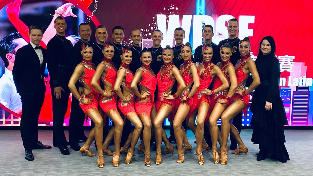Montag, 17 Uhr Ortszeit in Hongkong – endlich war es soweit: Das Lateinformationsteam von Blau-Weiss Buchholz betrat zum ersten Mal in der Vereinsgeschichte das internationale Parkett bei einer Weltmeisterschaft. Dem vorausgegangen waren viele Monate Vorbereitung. Als viertes Team starteten die Blau-Weissen mit ihrer Erfolgschoreographie „Made to Love“ in den WM-Wettkampf und „hauten direkt einen raus“, so Trainerin Franziska Becker. Die bereits auf der Deutschen Meisterschaft attestierte „Furchtlosigkeit“ sollte sich nun fortsetzen. In den vier Wochen zwischen den Meisterschaften konnte sich das Team nochmals enorm steigern und zeigte sich auf den Punkt fit beim internationalen Debüt. Auch vor Ort wurde statt Sightseeing noch hart trainiert. Der Ausrichter, der mit unglaublich viel Mühe eine perfekte Meisterschaft organisierte, hatte die Trainingsmöglichkeiten zur Verfügung gestellt. Die mit Höchstschwierigkeiten gespickte Choreographie überzeugte bereits zum Start mit fließenden Bilderwechseln, hochwertigen Tanzelementen und Übergängen. Dieser Eindruck verfestigte sich im Semifinale. Um 13 Uhr deutscher Ortszeit konnten sich die Fans in Deutschland dank der Live-Übertragung von Radio Bremen auch zuhause ein Bild machen und mitfiebern.