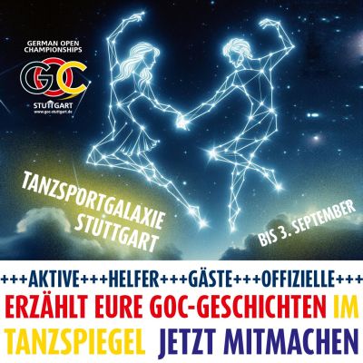 Egal ob Ihr Tänzer, Offizielle, Zuschauer oder Helfer seid, egal ob ihr euch alle Jahre wieder auf den Weg zur Liederhalle macht oder zum ersten Mal dabei seid - wir wollen eure GOC-Geschichten lesen! In der Stuttgarter Tanzsportgalaxie kommt es jedes Jahr wieder zu lustigen, spannenden, überraschenden oder gar kuriosen Erlebnissen. Erzählt uns davon und verewigt euch im Printuniversum.