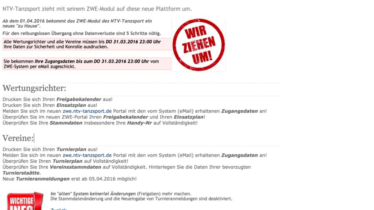 Achtung: Es sind alle Vereine und Wertungsrichter über unser NTV-ZWE-System angeschrieben worden mit dem Hinweis, dass das ZWE-Portal auf einen neuen Server umzieht. Es handelt sich hier um einen Serverumzug und nicht um einen Umzug des Büros des Niedersächsischen Tanzsportverbandes!