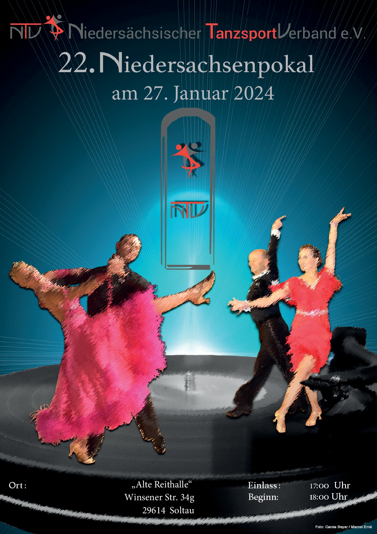Das NTV Präsidium hat auf seiner jüngsten Sitzung entschieden, für den kommenden Niedersachsenpokal am 27.01.2024 in Soltau eine Sektion "Solo Latin" mit in das Programm aufzunehmen. Die Vereine werden gebeten, ihre interessierten Solo-Tänzer:innen unter Angabe von Name, Verein, Telefonnummer und E-Mail per Mail bis zum 01.12.2023 an die Geschäftsstelle zu melden.